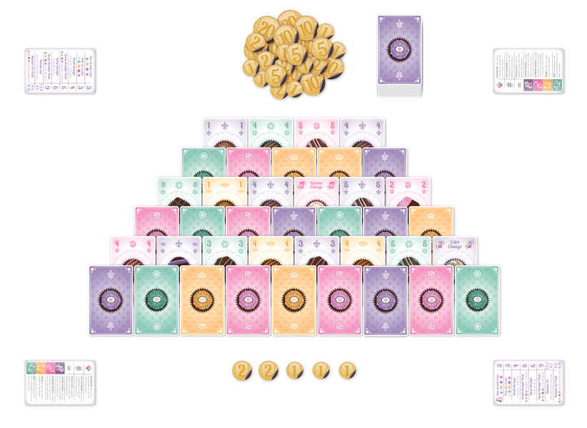 Les joueurs choisissent des confiseries en assortiment dans une boîte. Ces confiseries sont des cartes superposées les unes sur les autres. Complétez des séries, utilisez des cartes action et des modificateurs spéciaux pour l'emporter.