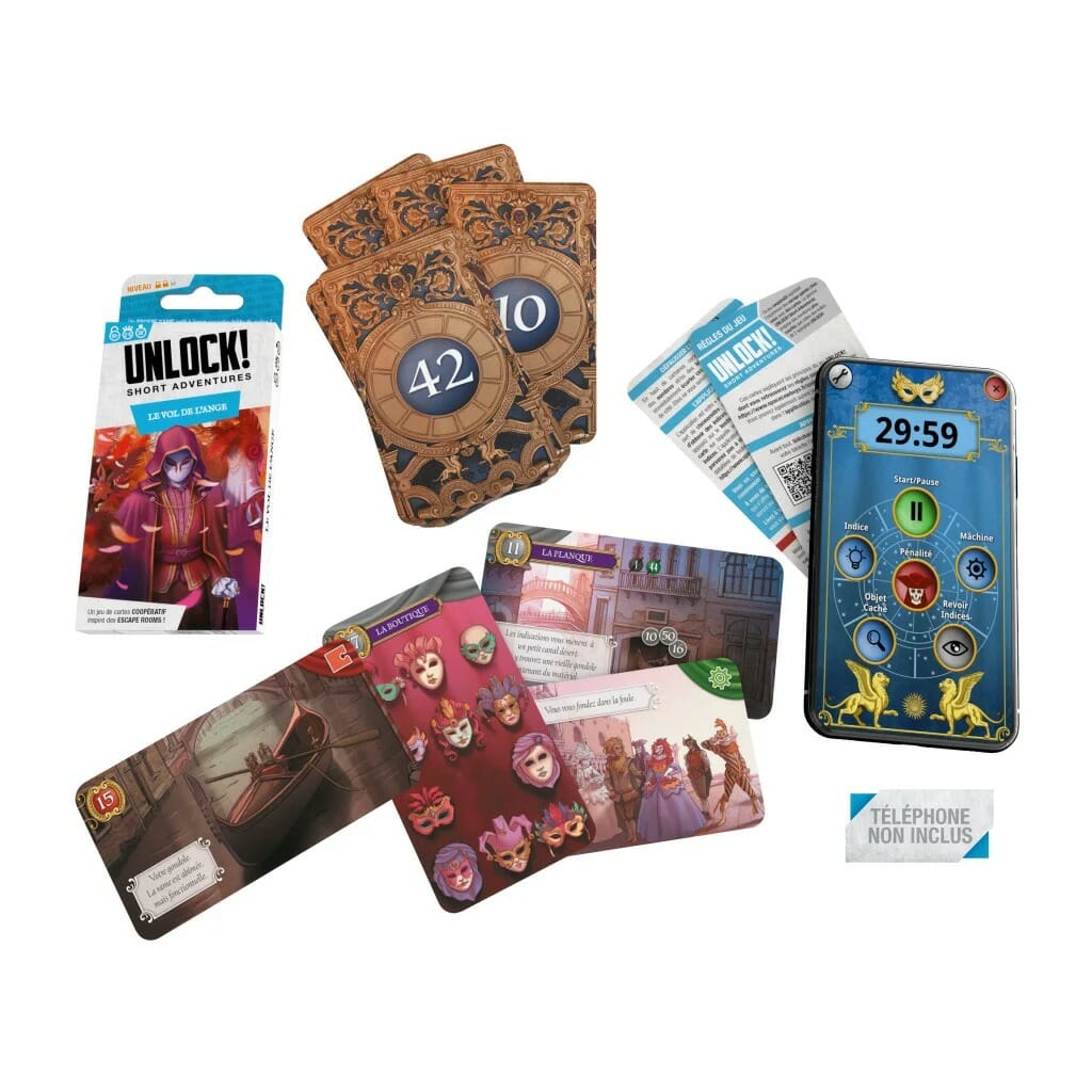 Unlock Short Adventures, ce sont des Unlock de 30 à 45 minutes en petit format, pratique à mettre dans la poche ou à offrir pour faire découvrir le jeu. Avec Le Vol de l'Ange, infiltrez le carnaval de Venise et remplissez votre mission secrète !