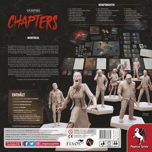 Vampire : The Masquerade - Chapters se déroule à Montréal, après l'apparition de la Seconde Inquisition et la chute du Sabbat. Conçu autour de trois piliers - histoire, stratégie et jeu de rôle - le jeu fusionne les meilleurs éléments des RPG et des jeux de société d'une manière totalement nouvelle.