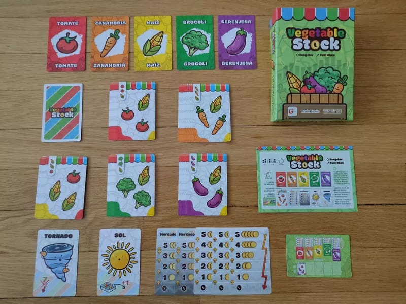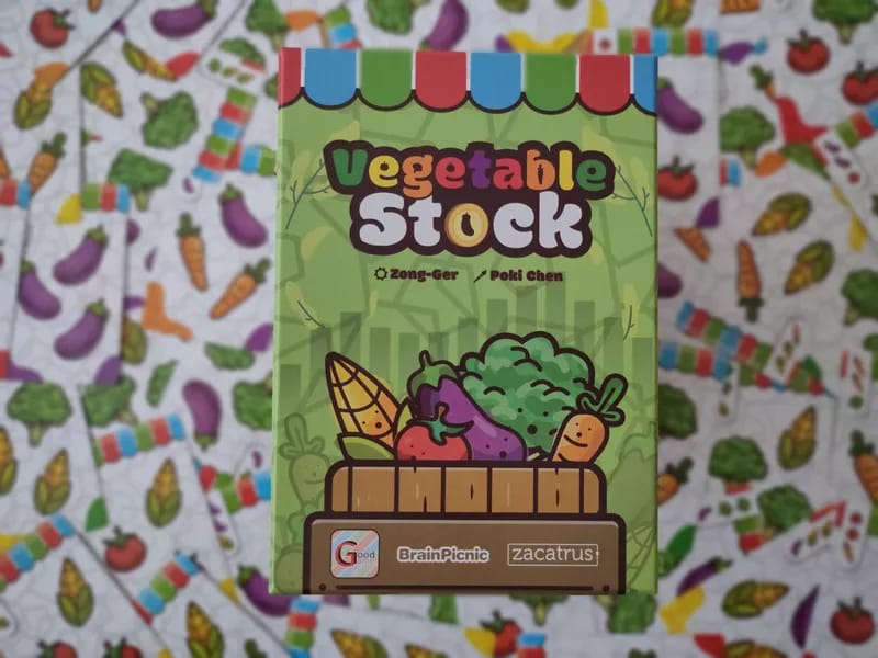 Vegetable Stock, qui a fait ses débuts sous le nom de Small Farmer, est un jeu de cartes simple sur l'économie des légumes. À chaque tour, révélez une carte de plus que le nombre de joueurs sur la table. Chaque carte comporte trois icônes de légumes, qui se déclinent en cinq types. À tour de rôle, les joueurs choisissent l'une des cartes et la placent dans leur pile de récolte, face cachée. Le prix du ou des légumes figurant sur la carte non choisie augmente - mais si le prix est trop élevé, il s'effondre, bien qu'il puisse augmenter à nouveau au tour suivant.