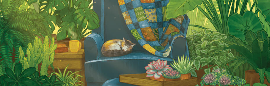 À chaque tour, vous sélectionnez une paire adjacente d'une carte et d'un jeton, puis vous utilisez ces éléments pour construire un tableau de cartes toujours plus grand qui représente votre maison. Vous devez garder à l'esprit divers objectifs pour tenter d'accroître la verdure des plantes en établissant des correspondances spatiales et en utilisant des jetons d'objets pour effectuer diverses actions de soin. Vous pouvez également développer vos compétences en matière de "main verte", ce qui vous permet d'entreprendre des actions supplémentaires pour prendre soin de vos plantes et créer l'espace le plus douillet qui soit !