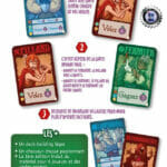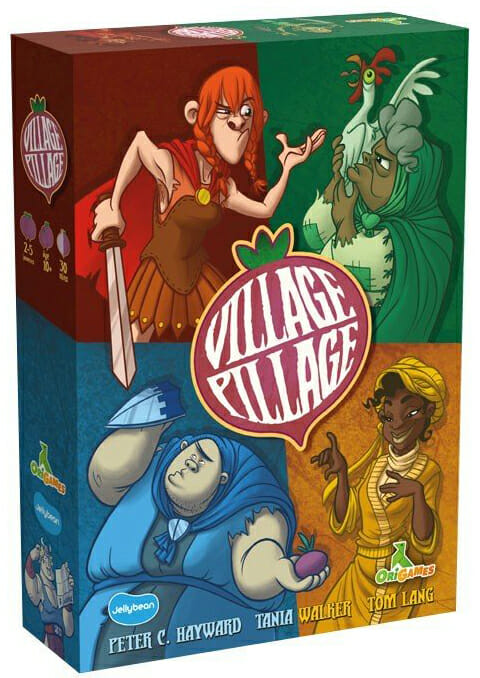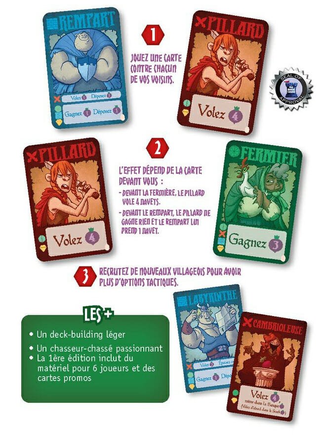 Village Pillage est un jeu de 2 à 5 joueurs pour des joueurs de 10 ans et plus. A chaque tour, les joueurs choisissent simultanément deux cartes de leur main et en jouent une contre chaque voisin.