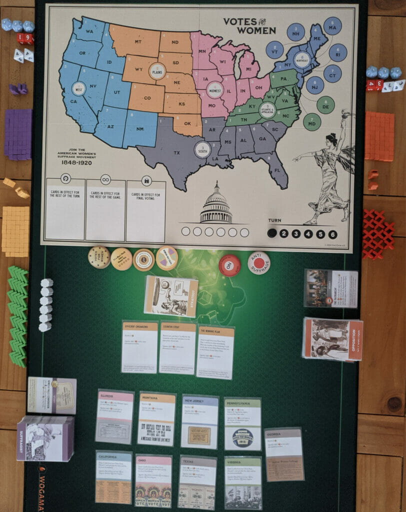 Votes for Women est un jeu de cartes couvrant le mouvement américain pour le droit de vote des femmes de 1848 à 1920, qui a culminé avec la ratification (ou le rejet) du dix-neuvième amendement. Le jeu permet de jouer en compétition, en coopération et en solitaire, ainsi qu'en coopération et en solitaire contre l'"Oppobot".