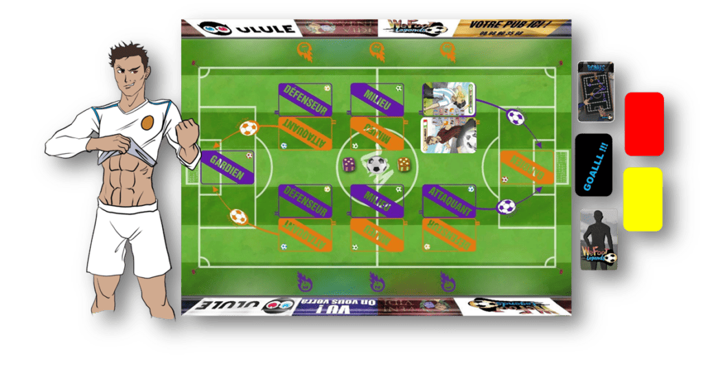 - 1 plateau de jeu, la règle du jeu, 1 dé violet, 1 dé orange, 1 jeton ballon, 58 cartes joueur, 98 cartes bonus, 7 cartes but, 7 cartons jaune, 2 cartons rouge.