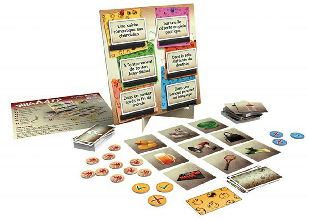 Whaaat ? est un jeu d'ambiance où vous devez faire deviner une situation à partir d'objets.Désignez ceux qui sont utiles ou inutiles dans votre situation, pour essayer d'aider vos partenaires de jeu.