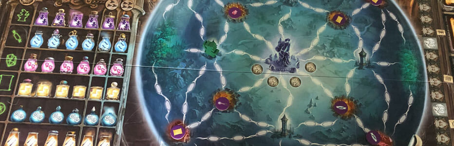 Déplacez votre jeton autour d'un pentagramme pour collecter des points et acquérir des tuiles hexagonales bonus ; vous pouvez utiliser ces tuiles immédiatement pour effectuer des actions ou les placer dans votre chaudron pour rendre plus intéressant le placement futur des tuiles.