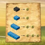 2/ construction. C'est le joueur qui aura la pierre noire qui débute, il est le leader. Il pose une première pierre et remporte des points en fonction du niveau (hauteur) de sa pierre. La base vaut 1 point, le 2e étage vaut 3 points, le 3e étage vaut 5 points, le 4e vaut 7 points et le 5e étage vaut 9 points, etc : Plus on est haut, plus ça vaut des points.