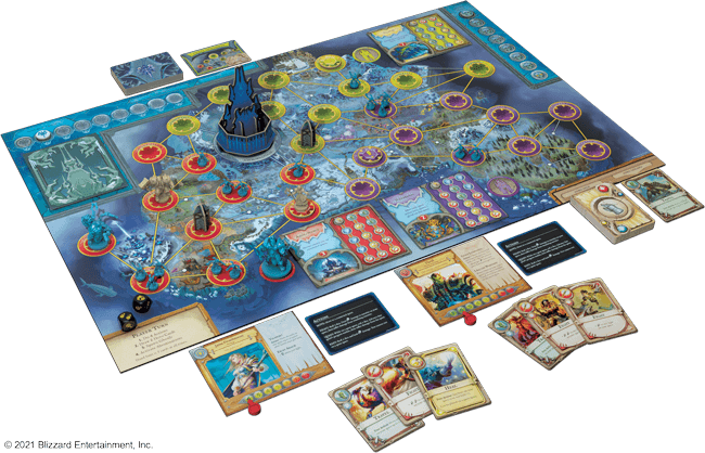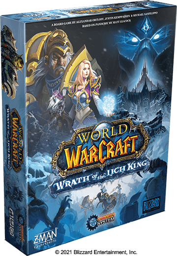 Dans World of Warcraft : Wrath of the Lich King, les joueurs se rendent sur le continent gelé du Norfendre pour affronter les armées du roi-liche. Ce jeu de type "système pandémique" présente des mécanismes et un gameplay familiers, désormais adaptés au contexte de Wrath of the Lich King. Des forts, des temples, des champs de bataille et bien d'autres choses encore peuplent le plateau de jeu tandis que vous et vos compagnons héros traversez le paysage froid. En chemin, vous établirez des forteresses, accomplirez des quêtes et affronterez des légions de morts-vivants.