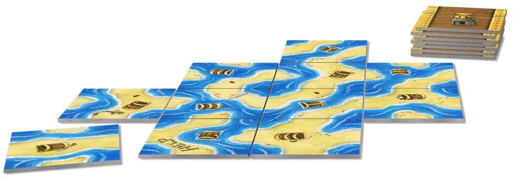 Un coffre au trésor se trouve au centre de chaque tuile, haaa enfin de la thune ! Voilà qui vous réveille le fond de l’œil. Et oui, il va falloir créer votre petit labyrinthe d'eau & de sable afin d’être le plus proche possible d’un max de trésors. S’ils sont plus proches de votre adversaire, ils seront pour lui.