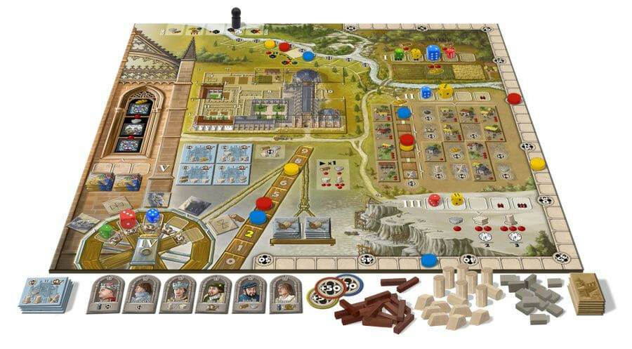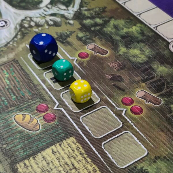 De cette façon, vous pourrez accumuler de la force de travail, obtenir un jeton de maçonnerie ou de vitrail, vous pourrez aussi récupérer des ressources bien sûr (bois, pierre…), progresser sur la piste de nourriture, etc.