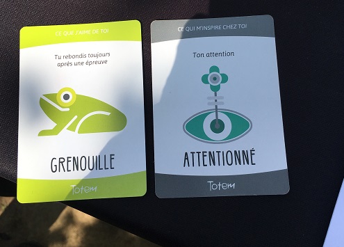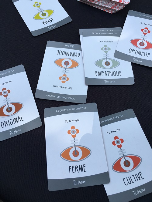 On a une main de cartes avec des qualités, et on en choisit une que l’on donne au joueur dont c’est le tour. Celui-ci les met en ordre selon ce qui lui correspond le plus. On explique ensuite pourquoi on a fait chaque choix.