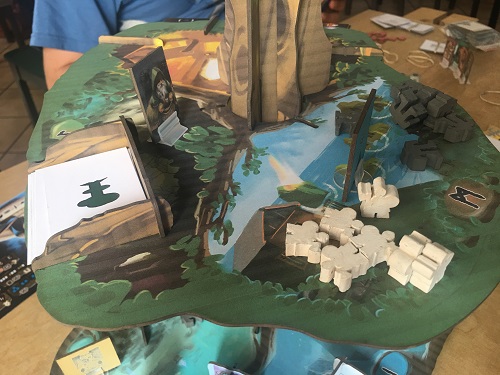 Entre Honshu et Kingdomino (mais en très simple), Un dernier donjon… est très interactif et bien méchant : on pourra recouvrir le terrain des autres avec nos cartes, le couper, placer des dragons, annexer des zones avec les ponts, protéger son royaume, ou parier sur un des ses fiefs qui vaudra plus de points. Très simple, Un dernier donjon… me semble être LE jeu familial joué pendant cette journée. C’est même plus simple que Grandbois, qui suit un peu le même principe.