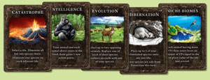L’adaptation : cette action (3 PA max) permet de prendre un jeton élément disponible afin d’adapter son espèce à cet élément ; se spécialiser dans un élément permettra d’être très fort en dominance sur tous les terrains possédant cet élément mais rendra nos espèces peu adaptées aux autres terrains… risquant ainsi l’extinction ; se diversifier permettra de s’épanouir sur la plupart des terrains mais rendra plus difficile l’obtention de la dominance.