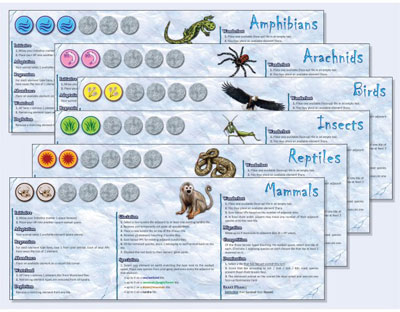 C’est être le règne animal le mieux adapté au terrain. Peu importe le nombre de cubes, cela n’influe pas sur la dominance, il faut juste avoir au moins une espèce présente pour y prétendre. On compte alors le nombre d’éléments du terrain auquel est adapté notre règne animal, on multiplie éventuellement par le nombre d’éléments du même type présent sur notre fiche. Ainsi l’amphibien, qui commence avec 3 éléments eau, aura 3 de dominance sur chaque terrain possédant un seul élément eau, 6 de dominance pour un terrain avec 2 éléments eau, etc… Bien sûr, on y rajoutera les éventuels autres éléments auxquels serait adapté l’Amphibien et qui seraient présents sur le terrain. Pourquoi est-ce mieux d’avoir la dominance ? Parce que lors du décompte des points sur un terrain provoqué par une action domination (voir description de la 12ème action ci-dessous), le règne animal ayant la dominance devra piocher une carte dominance. Ces cartes sont d’une puissance redoutable et à ne surtout pas négliger donc. Heureusement ce sont des actions uniques à exécuter immédiatement, mais elles peuvent bouleverser l’ordre naturel des choses.