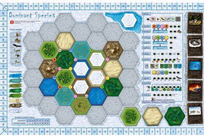 Les jeux GMT ont la réputation d’un matériel austère, voire cheap. Dominant Species en étant à sa quatrième édition, le matériel s’est largement amélioré et nous sommes loin de la carte en papier ou des tuiles de couleur uniforme (voir cette photo sur le site BGG pour vous faire une idée du « design » original). Quant à la qualité de cette quatrième édition, vous pouvez en juger par vous-même à partir de la photo ci-dessous prise lors de l’explication des règles :