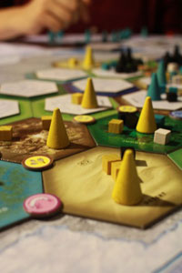 J’abordais cette partie avec une certaine crainte. Si on m’avait prévenu de la durée probable d’une partie (entre 3h et 6h), ce n’est pas tant cela qui me faisait peur que le rythme. En effet, j’avais peur qu’à chaque action modifiant la configuration du plateau, on soit obligé de vérifier les dominances et que le jeu soit haché. Rien de tel au final. Un point de règle important est que les dominances sont à la discrétion des joueurs et si un joueur a oublié de vérifier s’il avait repris la dominance, tant pis pour lui. Cela peut même devenir du bluff en laissant la dominance (le cone) adverse sur le plateau et en demandant une vérification au moment d’un décompte pour s’emparer alors de la dominance et par là même de la carte qui va avec. Outre ce point qui évite de tout vérifier systématiquement, il s’avère que dans la plupart des cas c’est tellement évident qu’il n’y a pas eu de calcul à faire.