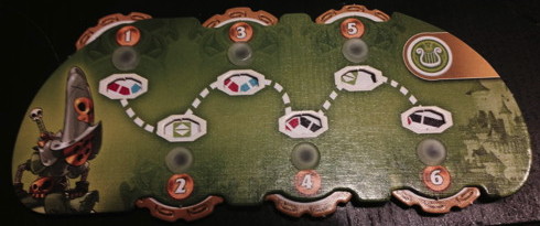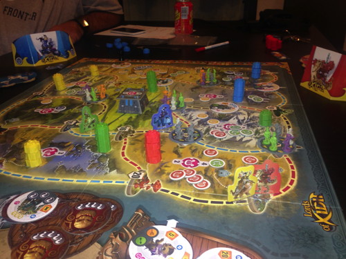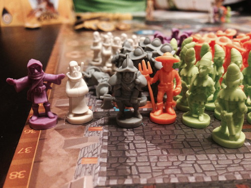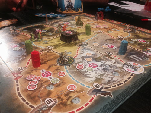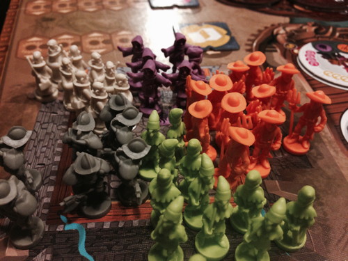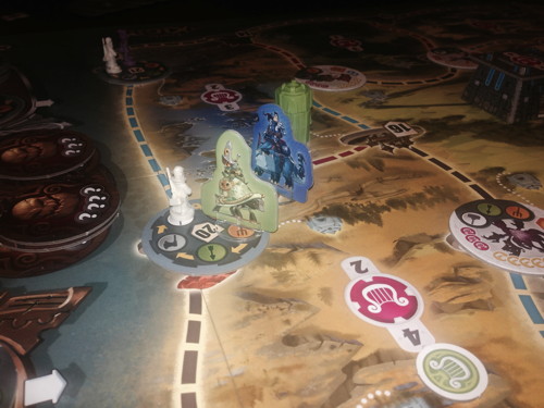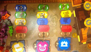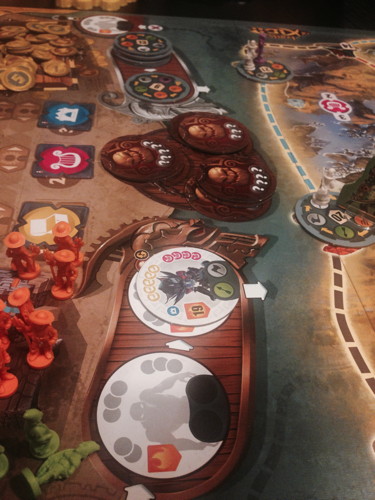 Sur la partie en cours, les Idrakys bleu et verts sont clairement en retard sur la renommée. Et de mémoire, le vert est bien placé sur l’argent alors que le bleu est également en difficulté. On remarque sur la photo que l’idrakys vert est en avance sur la magie, et c’est la magie qui permettra d’emporter la partie. En revanche, si l’Idrakys vert se fait éliminer sur la renommé, c’est un autre qui gagnera, même si il reste le meilleur en magie. Celui-ci va donc s’efforcer désormais de réclamer les récompenses de renommée, tandis que le bleu va tenter de gagner de l’argent pour ne pas se faire éliminer dès le premier décompte.