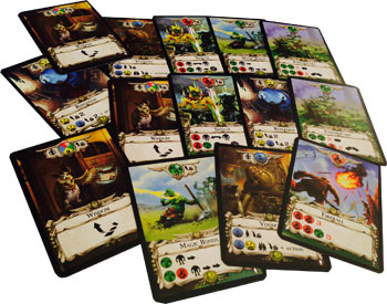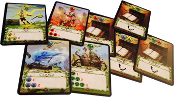 L’aspect deckbuilding est à la fois facile et malin. On a des cartes sorts d’Attaque, des sorts de Savoir (qui servent à acheter d’autres cartes), et des sorts de Soutien. Chaque carte peut être utilisée de plusieurs façons mais cela est rendu très compréhensible par l’iconographie.