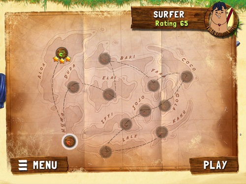 Et bien la version Ios ne fait pas beaucoup mieux : La page d’accueil est un peu sommaire, une plage de sable blanc avec une demi-étoile de mer et deux coquillages quelques peu caricaturaux. Les options et succès que l’on devine dessinés dans le sable sans que l’effet soit très réussi. Seules les planches en bois des différents menus sont assez bien faites.