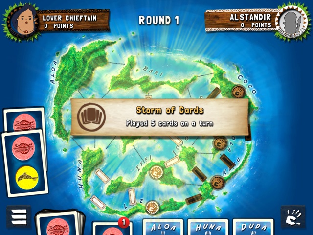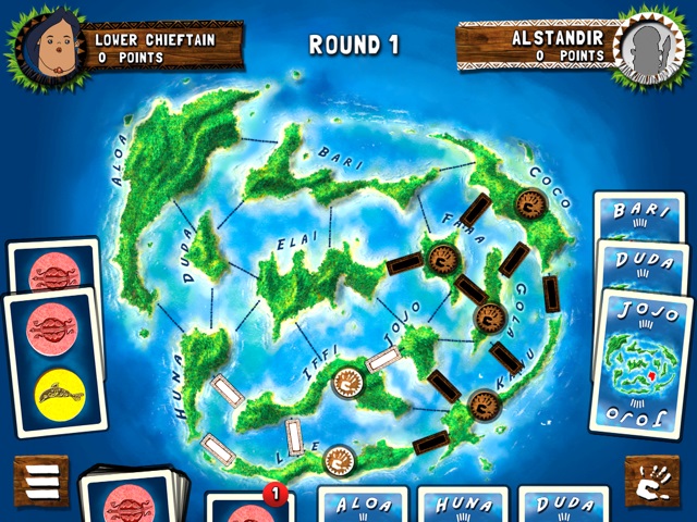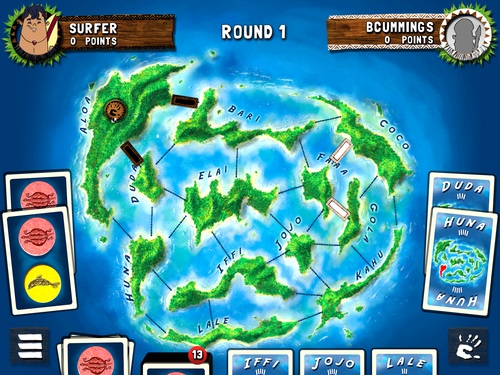 Alors pourquoi dis-je « presque » parfait ? Très simple, c’est à cause de la pioche des cartes placées face visible. En effet celles-ci se trouvent tout à fait en bas de l’écran et seul leur nom est visible, contrairement aux vôtres où vous avez (je l’ai déjà dit mais on a le droit d’être distrait) l’ile correspondante colorée en rouge pour la repérer. Un détail ? Pas pour moi qui ait un mal fou à repérer l’emplacement des iles, bien que l’auteur ait eu la sainte idée de les placer plus ou moins par ordre alphabétique. Ceci est d’autant plus pénible que si vous avez le malheur de toucher une carte vous la récupérerez instantanément, sans avoir à confirmer votre action. J’aurais plutôt vu la chose en deux temps : un tap et la carte se soulève pour montrer la position de l’ile à laquelle elle fait référence sur le plateau, puis un autre tap pour valider son choix.