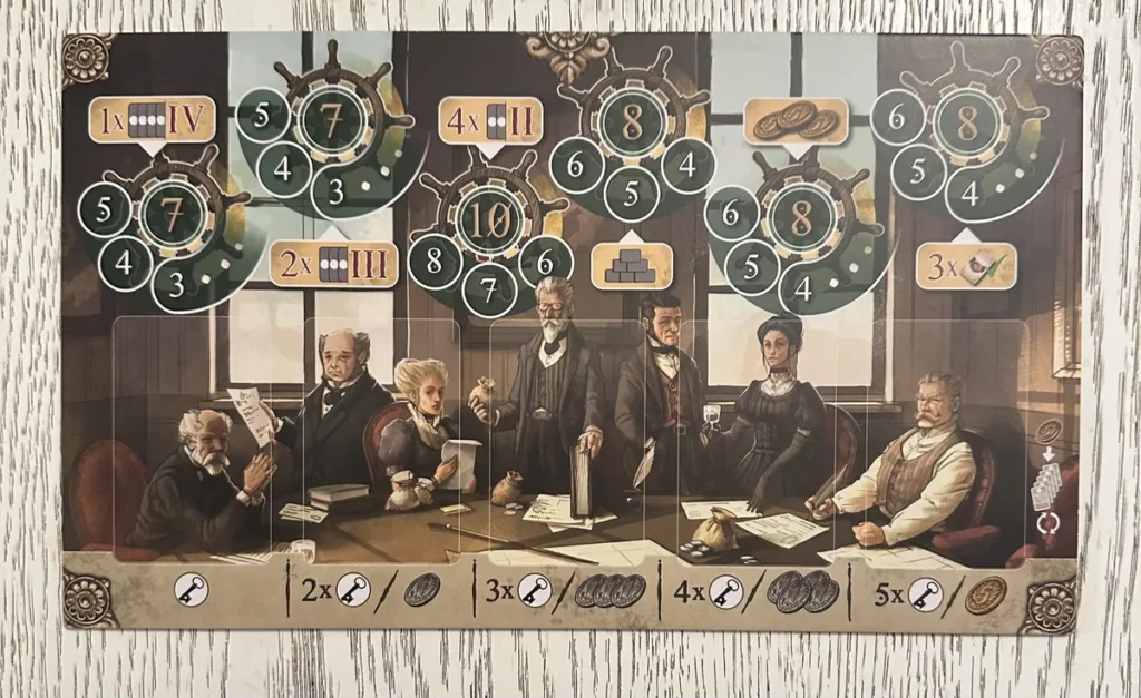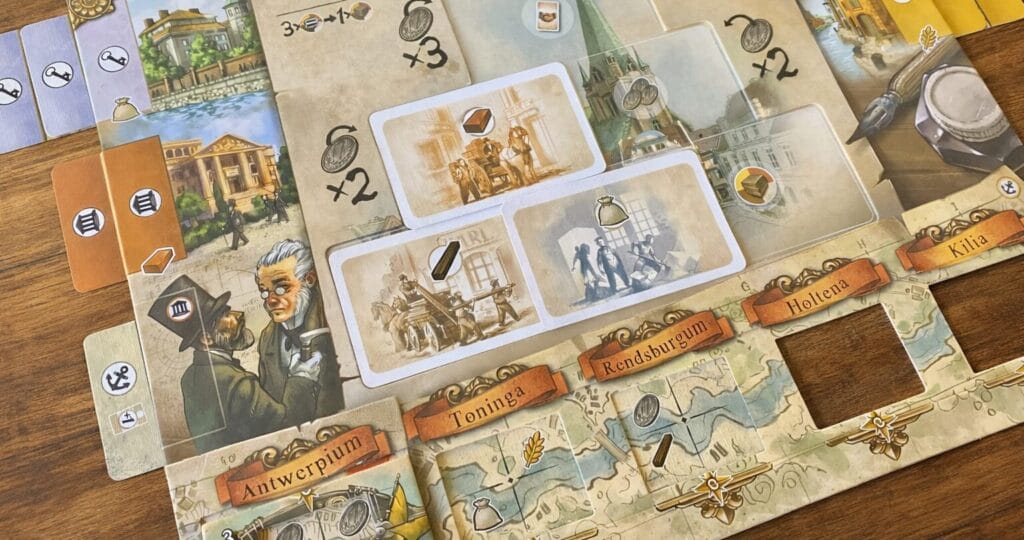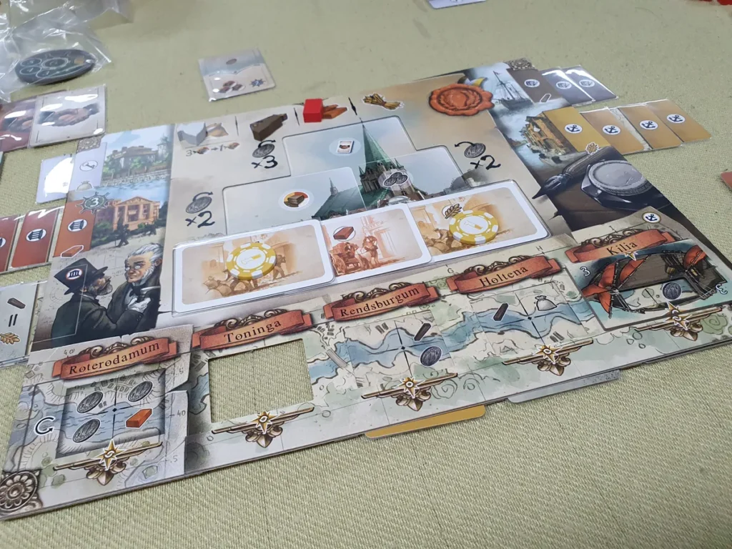 Le plateau personnel de Kilia fonctionne comme un hub central évoquant la ville de Kiel, avec sa place de marché animée et sa mairie imposante en arrière-plan. Il comporte des emplacements de lieux latéraux sous lesquels vous glisserez vos cartes (jusqu’à 4) afin de simuler le développement de ces lieux. L’Université débloque de nouvelles compétences d’échange, des bonus et des points de fin de partie. Le chantier naval améliore votre tuile bateau, augmentant sa capacité à transporter les marchandises issues du développement de l’Entrepôt, que vous allez étendre le long du Schleswig-Holstein. Le Château représente votre influence auprès du gouverneur : il vous permet de gagner des clés pour accéder gratuitement à davantage de cartes Action et Objectif. Lorsqu’un un joueur a validé son quatrième objectif commun, la partie entre dans sa dernière manche.