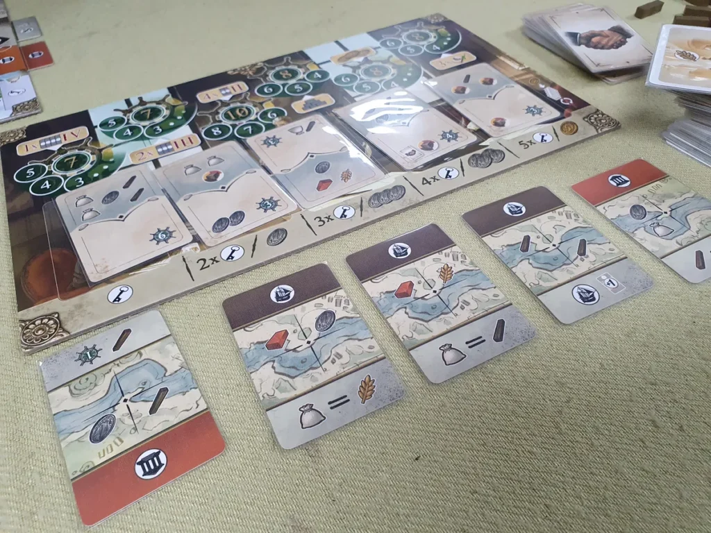 Concernant la polyvalence des cartes d’action, à chaque tour, le joueur choisit une carte parmi les cinq proposées, en payant un coût en clés selon sa position dans la rivière ou, à défaut, en pièces. Chaque carte comporte trois sections au verso et une au recto, chacune correspondant à une action spécifique. En haut de la carte se trouve une icône de développement désignant la zone concernée. Au centre, la section Entrepôt permet d’étendre votre réseau logistique. En bas, des compétences supplémentaires s’ajoutent lors du développement de l’Université. Ces cartes sont jouées sous le plateau, à l’emplacement correspondant à leur action. Enfin, au recto, un symbole de ressource identifie la ressource associée à la carte, qui sera placée au centre du plateau, sur la place du marché.
