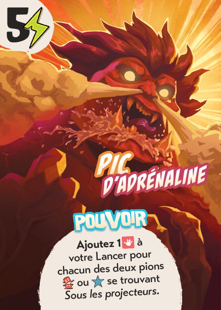 Désormais, les cartes Énergie viennent sur une rivière de trois emplacements au-dessus du plateau (avec une petite ristourne sur le prix de la dernière carte). Et oui, il y a un plateau, et ce dernier est assez différent de ce que KoT propose habituellement : nous aurons désormais deux pistes, Gloire et Destruction, avec chacune un pion dessus que les protagonistes tâcheront d’amener de leur côté du plateau dans un jeu de tir à la corde. Il vous faudra trois icônes Gloire ou trois icônes Destruction sur vos dés pour que le pion éponyme commence à se déplacer dans votre sens. Après quoi, tous les symboles additionnels permettent de bouger d’une case de plus. Si vous parvenez à tirer les deux pions sur la zone de la victoire “sous les projecteurs”, vous l’emportez. Mais vous pouvez aussi gagner en attirant un seul pion tout au fond de la piste. Vous avez pu voir Gigazaur, son pouvoir (activable avec deux icones !) permettra de tirer l’un des deux pions d’une case, pour accélérer potentiellement la victoire sous les projecteurs.