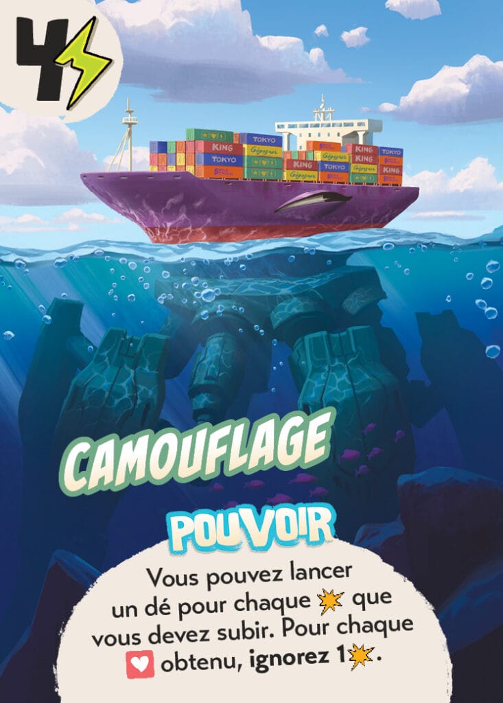 Sinon, on continue de jeter les dés, façon Yatzee, avec trois lancers de 6 dés, dans le but d’obtenir des icônes baffes qui feront baisser les points de vie adverses (pourquoi pas jusqu’au KO final), ou des cœurs pour vous soigner, ou de l’Énergie avec les éclairs, ressource utile pour l’achat de cartes Énergie (pouvoir ou action). Vous pouvez aussi déclencher votre pouvoir spécial par l’obtention d’icône point d’exclamation.