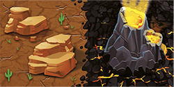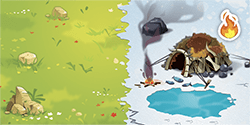 > Des plaines avec des mammouths, des zones rocheuses avec des silex, des forêts avec des champignons, des lacs avec des poissons…. et des volcans, inhabitables mais… qui crachent le feu !