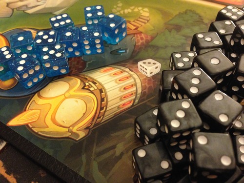 La partie que nous avons faite s’est déroulé bizarrement. On commence doucement chacun à récupérer des petits dés mis à part votre serviteur qui prend un risque deux fois pour avoir un dé rouge assez tôt et qui se fait deux fois débouter alors qu’il avait 2 chances sur 3 de réussir son coup !