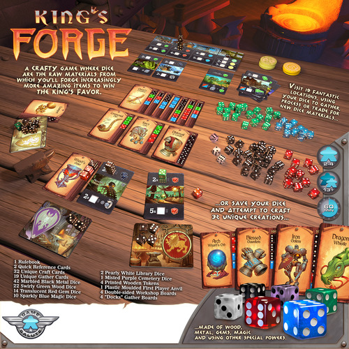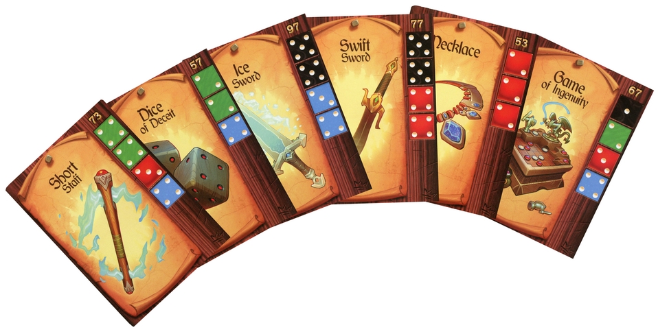 Ces objets nécessitent certaines couleurs de dés (noir=métal, vert=bois, rouge=gemme et bleu=magie) et un score minimum pour chacun de ces dés. Par exemple, « Game of Ingenuity » nécessite au moins un 1 noir, un 2 vert, un 3 rouge et un 4 bleu. Vous pouvez faire plus, mais c’est le minimum à obtenir sur chacun de ces dés pour réclamer l’objet pendant la phase de craft.