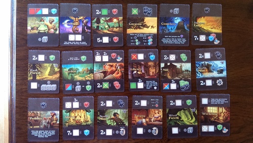 Le paquet de cartes rassemblement se compose de 11 cartes (14 avec l’extension apprentis). Quatre qui seront toujours identiques (les mines du nord et du sud, et les forêts d’est et d’ouest) et les autres qui seront tirées au hasard parmi toutes les autres cartes de rassemblement. Système qui nous garantira de ne pas jouer deux fois la même partie.