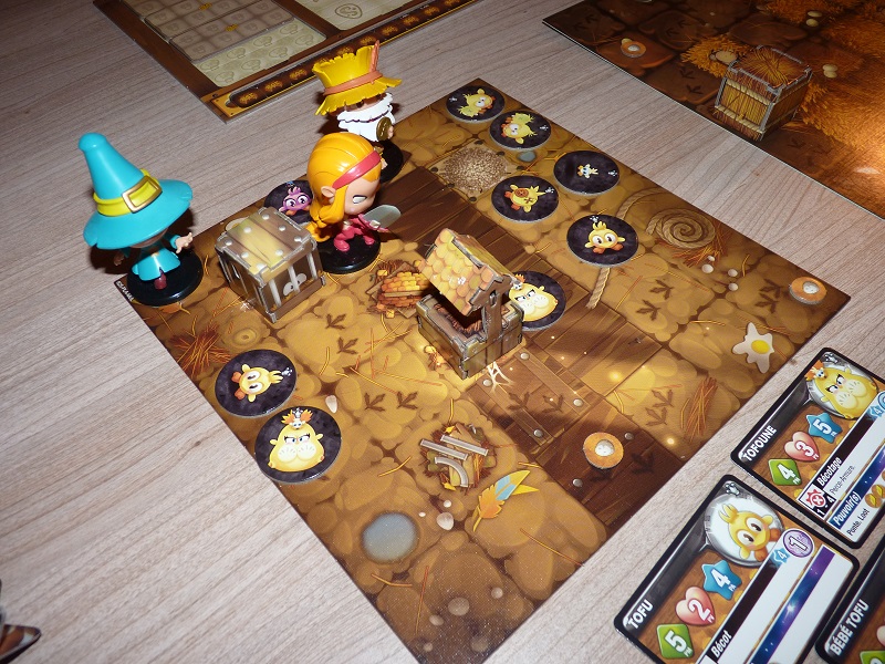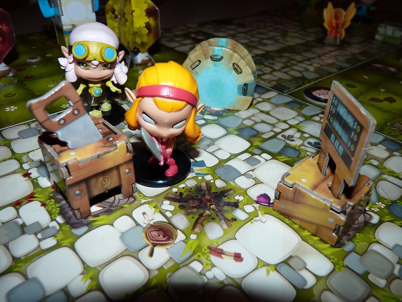 Nous repartons pour un tour dans le scénario « La Tofubine a bonne mine » où les héros doivent escorter un tofu rose dans les profondeurs d’un donjon, histoire de botter les fesses du Maître de Maison. Ce choix nous permettrait de nous faire une idée plus précise de l’intérêt de ces donjons. Quant au Démon, son objectif est de dévorer les GG des héros (il élimine les points de victoire en partant de la gauche de la piste de décompte, sachant qu’un Krosmaster n’ayant plus de GG ne peut plus en gagner, rendant l’équipe à la merci d’une victoire du Démon). Les Aventuriers devront donc veiller, en plus de leur objectif final, à maintenir leur échelle de points de victoire.