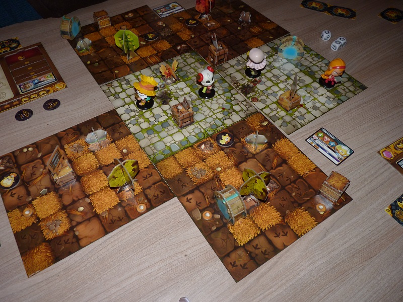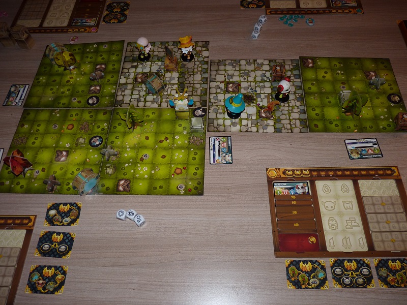 Mis à part ce petit défaut, il faut se rendre à l’évidence : le matériel a la classe lorsqu’il est disposé sur la table, et invite irrésistiblement le joueur à prendre part à l’aventure. Les éléments en carton, variés et en grand nombre, donnent du relief au plateau de jeu, ce qui permet une bonne lisibilité de l’ensemble. Cependant, les monstres sont représentés par de simples jetons qui se perdent un peu dans les décors. On aurait préféré des stand-up cartonnés qui auraient permis de plus facilement les identifier, d’autant plus que pour le noob, il est difficile de faire la différence entre les espèces de tofus et de bouftous !