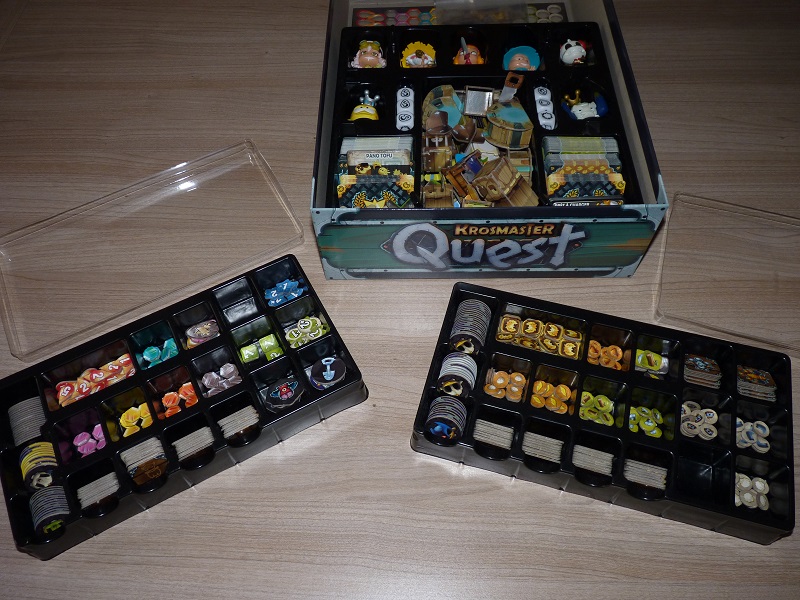 J’avoue que j’ai été agréablement surpris à l’ouverture de la boîte par l’impressionnante profusion de matériel. Le jeu m’ayant été fourni « prêt à l’emploi », je n’ai pas eu à dépuncher les différentes planches, ni même à monter les différents décors en carton, exercice qui dans ce cas précis, m’eut paru relativement fastidieux. En tout cas, l’éditeur ne s’est pas montré radin car pour une cinquantaine d’euros vous pourrez découvrir des centaines de jetons, des dizaines de décors, de multiples cartes, et 7 figurines (dont deux exclusives, histoire d’attirer le chaland), KQ est réellement un monstre.