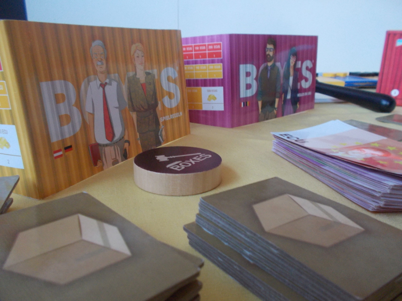 Outre son désormais classique Avalam, qu’on rencontre en version géante dans tous les festivals, Vincent Sélenne était venu avec les deux jeux de Benoît Rémy, Tactic Elastic, et son dernier, Boxes, jeu d’enchères au format « container » extrêmement sympathique.
