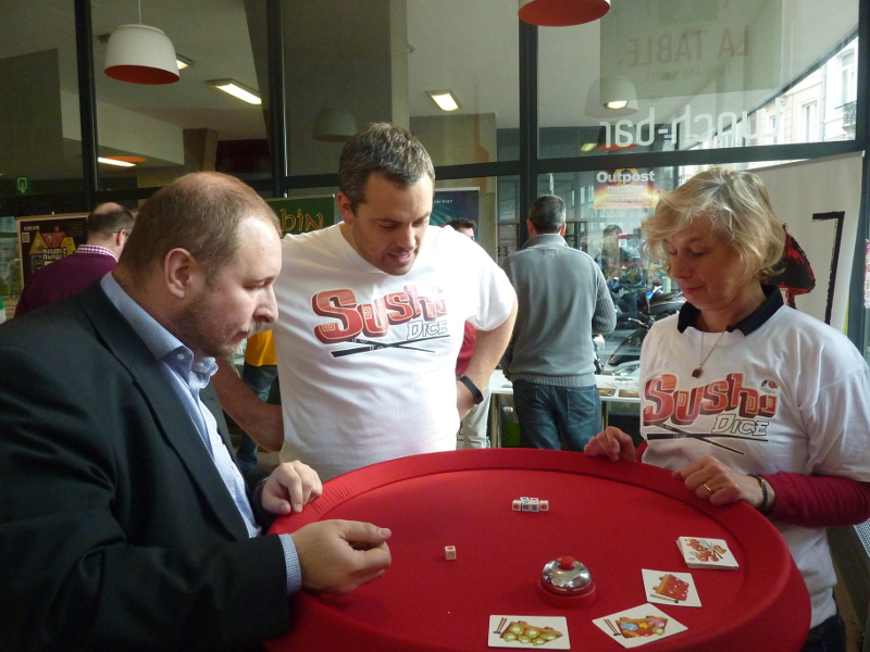 A droite, Cédrick Caumont de Repos Prod s’essayant à Sushi Dice