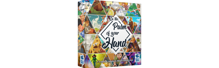 Il s’agira du premier jeu de Timothée Decroix, publié cette année chez La Boite de Jeu, plutôt habitué à un public moins familial (même s’il y avait déjà eu Grumpf) voici In the Palm of your Hand en anglais dans le texte, que l’on traduira donc par « Au creux de ta main » chez nous. Quelque part entre Palm Reader, Pictures et Maître Renard, voici un nouveau jeu coopératif de communication où vous allez devoir faire deviner une scène, délicatement illustrée par l’un des quatre artistes à l’œuvre (Pauline Detraz, Gaël Lannurien, Sabrina Miramon, et Tohad), en utilisant des objets dans la paume de la main d’un autre joueur qui aura les yeux fermés.