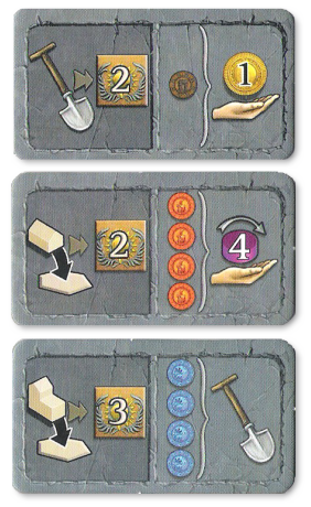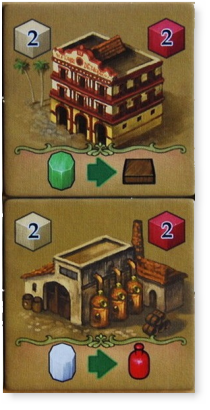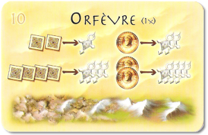 Encore faut-il collecter 4 ressources identiques, ce qui est relativement contraignant dans ce jeu où le stock est plafonné à 10 unités toutes ressources confondues, et où les cases d’action obtenues ne sont pas toujours nos premiers choix du fait des blocages de l’adversaire. Ne négligez pas cet Orfèvre pour autant, une ou deux visites biens senties vous permettront d’écouler un surplus d’une denrée dont vous n’avez pas une utilité impérative dans l’immédiat. 3PV pourraient bien faire la différence au moment de compter les points de cet affrontement souvent très serré. |
