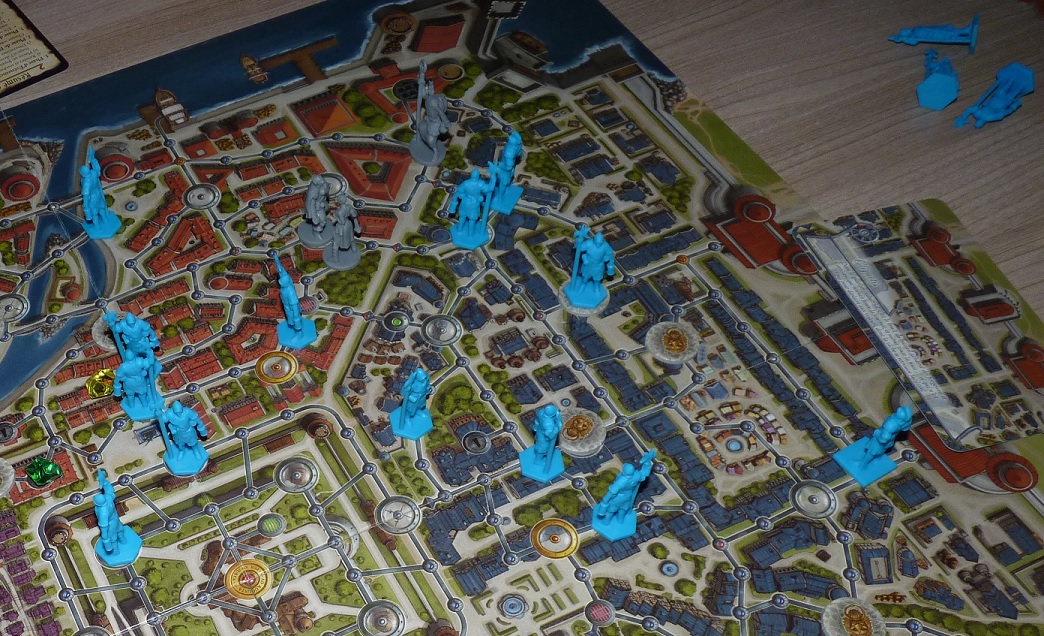 Un grand plateau représente une vue aérienne de la cité, avec les quatre quartiers de la ville, et le Palais central. Sur ce plateau, on retrouve les différents chemins servant aux déplacements des voleurs, des gardes et des capitaines. L’ensemble est agréable à regarder, mais la taille des points accueillants les figurines et la profusion d’éléments de décor est préjudiciable à la bonne lisibilité des événements : peut-être qu’un plateau légèrement plus grand aurait aidé à la bonne lecture du jeu.