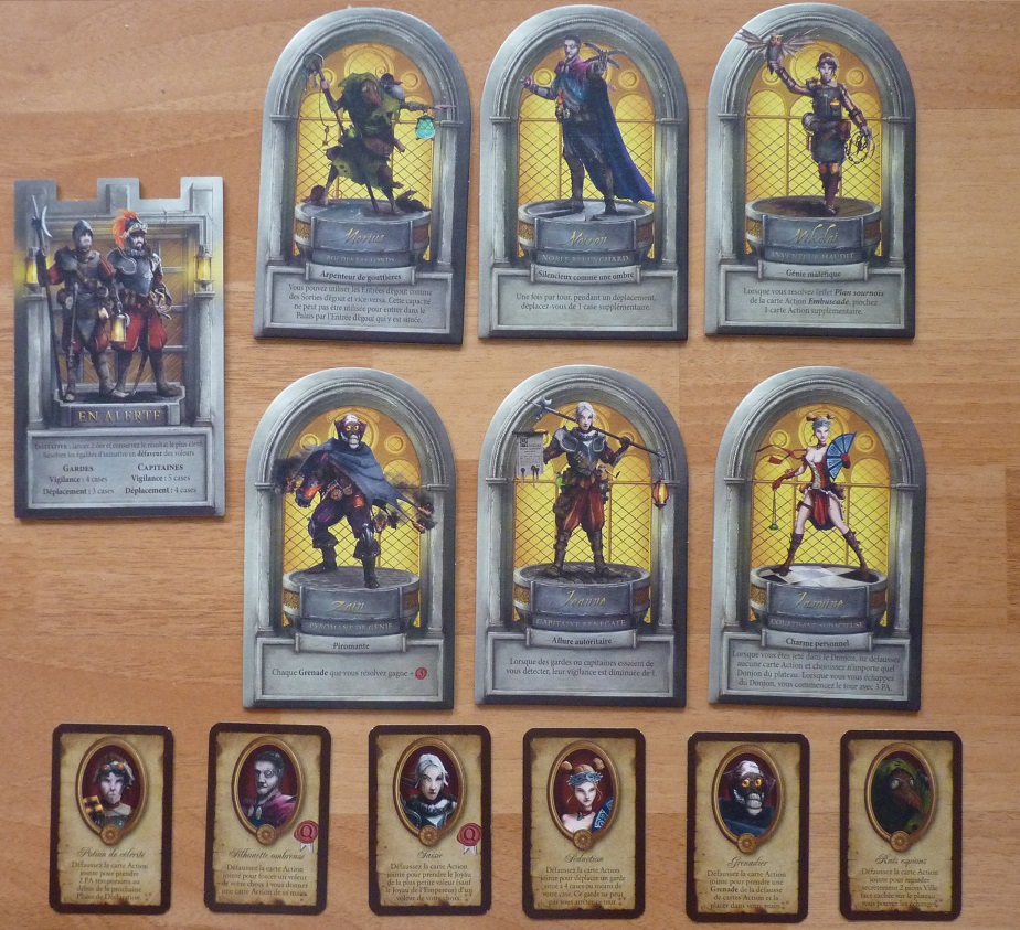 Le reste du jeu est constitué de nombreux jetons, marqueurs, joyaux en plastique, et dés à huit faces. On retrouve également les fiches des personnages (voleurs et miliciens), ainsi que de nombreuses cartes. On distingue les cartes événements qui apporteront des modifications temporaires de règles pour le tour en cours, ainsi que des cartes actions avec les compétences spéciales des voleurs et les différents objets qui pourront être récupérés. Le tout est très joliment illustré et permet de plonger les protagonistes au coeur de la ville.