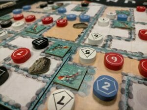 Nous avons tous des Galets avec des valeurs de 1 à 9. À son tour, on place un galet sur le plateau commun, mais en respectant les règles du Sudoku : la valeur ne peut être présente dans la ligne, la colonne ou le jardin. Autre contrainte, nos prochains pions Galets, doivent être placés dans l’alignement d’un autre de nos jetons, en ligne ou en colonne. De tour en tour, nous plaçons nos galets, soit pour accroître une majorité soit pour essayer d’en voler une autre. La mécanique du Sudoku est intéressante ici car elle peut nous bloquer, ou bloquer l’adversaire si l’on voit ce qui lui reste comme jeton Galet.