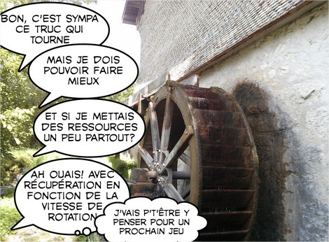 Mais la roue ne fait pas tout. Il va falloir trouver du monde pour la tourner. De gentils petits ouvriers qui vont aider à l'alimenter. Des porteurs d'eau, des bûcherons, des charbonniers, etc.. Tous avec une devise :