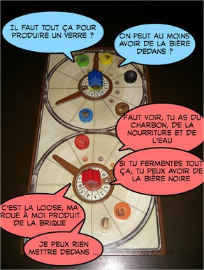 Si on essaye d'expliquer ce savant principe, on va cumuler nos ressources de base sur la roue magique, et hop, dés qu'on a tout ce qu'il faut, la roue tourne et on obtient immédiatement et miraculeusement une belle ressource manufacturée, toute neuve. Et on perd les ressources de base, évidemment. Sinon, tout ça serait un peu trop facile.