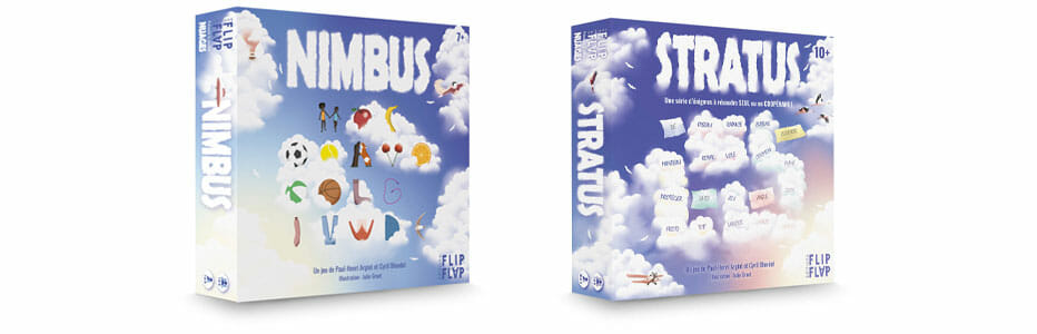 Nimbus s’adresse à des petits joueurs dès 7 ans. Cette fois pas de petits cailloux mais des polyominos nuageux de formes différentes, que l’on va placer non sur des mots, mais sur des images qui ont une référence commune. À la fin, des lettres vont apparaître sous forme de paréidolie. Ces lettres vont servir à dévoiler la solution de l’énigme.