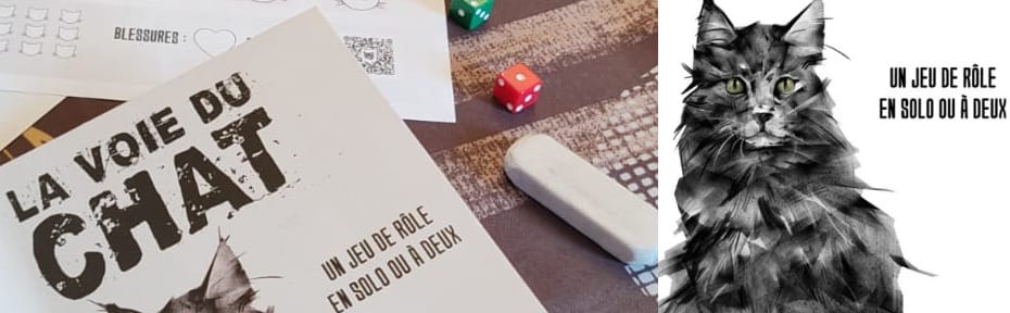Dans la Voie du Chat, vous incarnez un chat qui explore le monde qui l’entoure avec différentes missions. Il a des compétences, atouts et faiblesses, renseignés sur sa feuille de personnage. Vous suivez sa progression sur une carte de territoire, quadrillage sur lequel vous allez dessiner les lieux de votre exploration. Vous aurez besoin de ces deux documents, de plusieurs dés à 6 faces, et de quelque chose pour écrire votre histoire. Rien de plus !