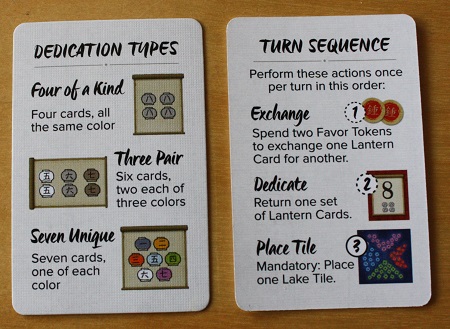 - (optionnel) On peut dépenser des cartes lanternes pour récupérer une tuile de dévouement ; il faudra un carré de lanternes de même couleur, une lanterne de chacune des sept couleurs ou trois paires de lanternes de la même couleur. On ne peut récupérer qu’une seule tuile dévouement par tour.