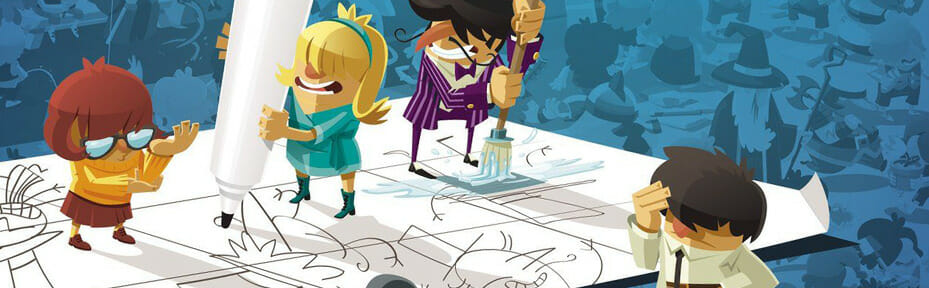 Oui mais comment le groupe détermine-t-il le coupable à partir du dessin ? Excellente question ! C’est là l’autre originalité du jeu qui rappellera le fameux MicroMacro Crime city. La boîte offre plusieurs illustrations de scènes qui s’étalent sur votre table (à chaque partie, vous en choisissez une). Sur ces illustrations (signées Vincent Dutrait & Stéphane Escapa), de très nombreux protagonistes sont représentés dans de multiples situations. C’est un peu où est Charlie, un défi pour vos yeux ! Le groupe pourra-t-il dénicher où se cache le coupable dans tout ça avec les bribes d’info qu’il détient ? Pas facile !