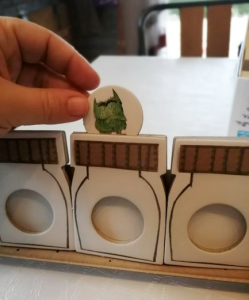 Une fois que la situation a été énoncée, nous pouvons aller sur « l’étagère » pour retourner un flacon (l’étagère n’étant rien de plus que le petit support pour poser les flacons pendant la partie). En effet, chaque flacon a une couleur au verso, une pour chacune des émotions, mais il y a aussi trois flacons barbouillés. Si vous retournez le flacon correspondant à la bonne émotion, vous pouvez ranger votre jeton dans le flacon et le remettre sur l’étagère, c’est un premier pas vers la victoire. Si ce n’est pas la bonne émotion, il vous faudra vous rappeler quelle émotion se cache derrière ce flacon-là et y revenir au bon moment. Enfin, si le flacon est barbouillé, vous le laissez visible. Si les trois flacons barbouillés sont visibles, c’est perdu. Cependant, si vous déplacez la petite fille jusqu’au Monstre des couleurs, vous pouvez retourner à nouveau un flacon barbouillé, mais attention il faudra bien vous rappeler où il est placé !
