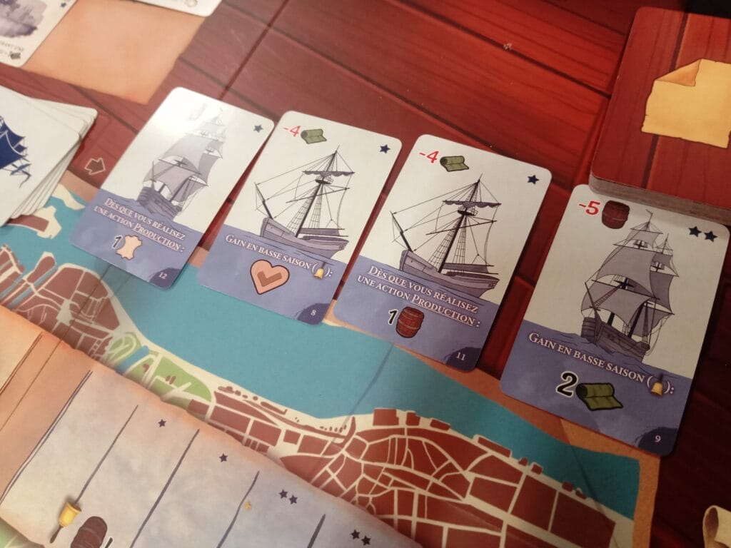 La Basse saison, peu utile, au démarrage devient elle aussi pourvoyeuse de bonus. Une petite majorité de navires, un curseur bien placé sur la piste de prestige peuvent apporter de quoi compléter le stock et donner de quoi réfléchir à votre rival qui voit soudain que l’élément qui vous manquait est apparu. Tout comme les cartes spéciales, dont on va user pour bénéficier d’effets, ressources, au moment opportun et surprendre l’adversaire. Si certaines sont visibles, d’autres sont piochées et inconnues.